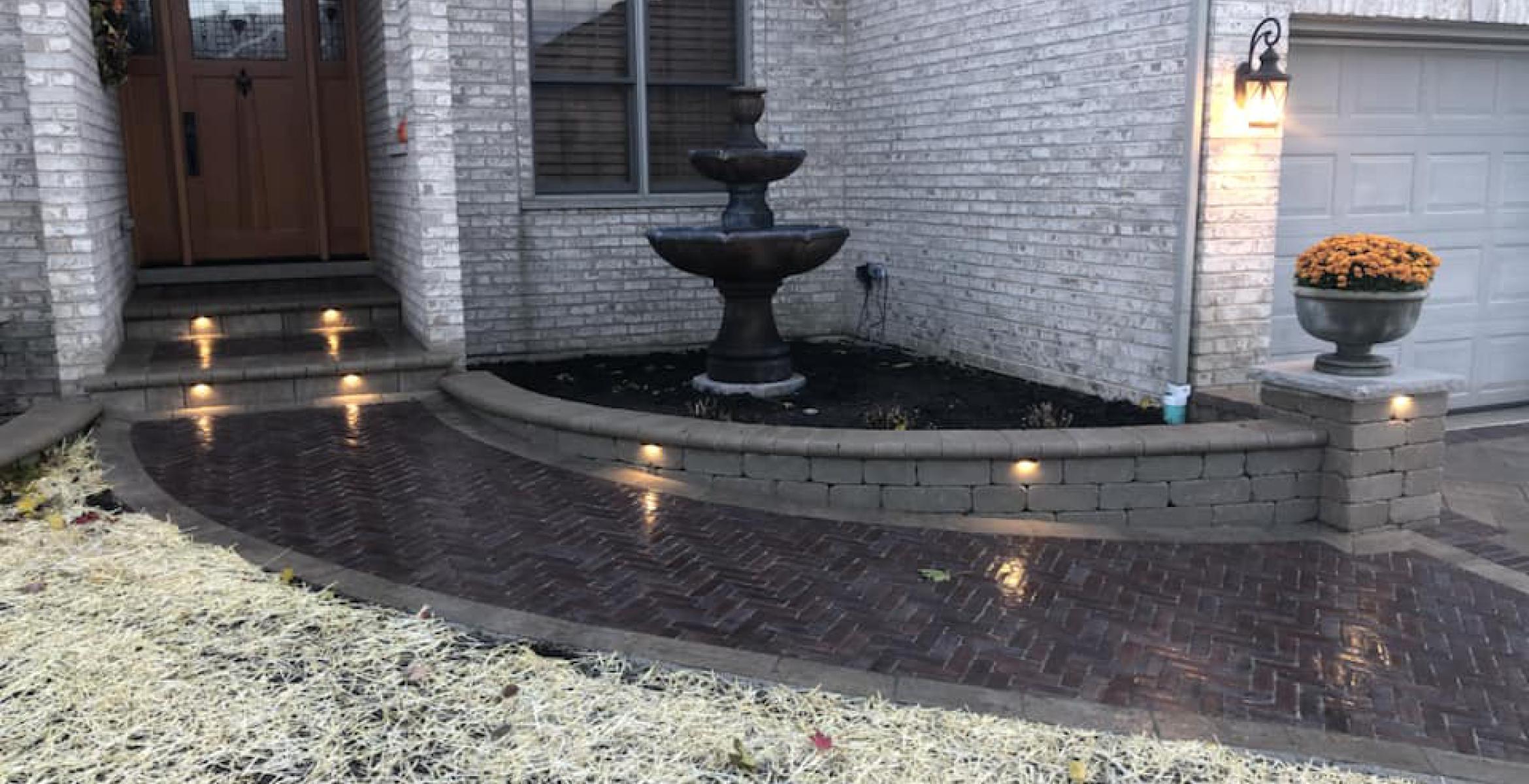 unilock brick driveway sidewalk entryway lighting