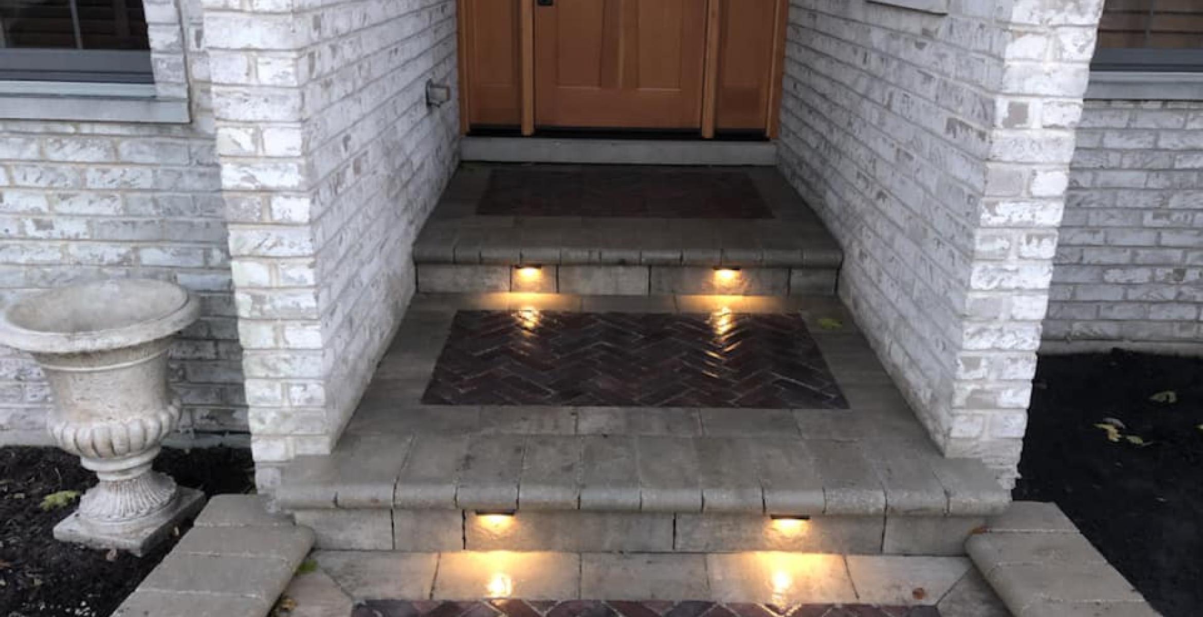 unilock brick driveway sidewalk entryway lighting