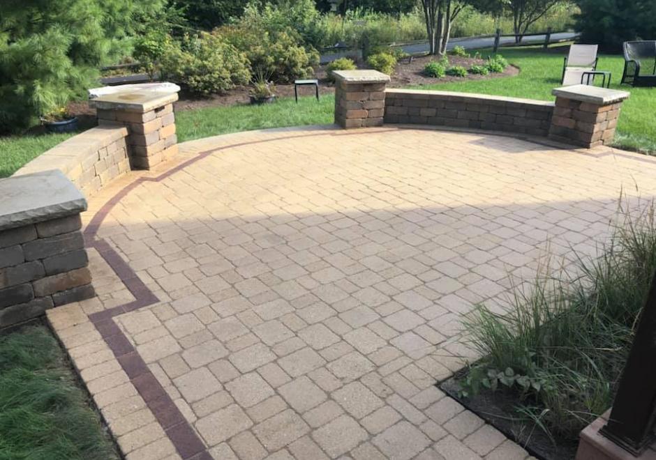unilock brick patio with retaining walls